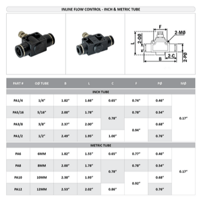 PA3/8 FLOFLEX – Plastic push-in pneumatic fitting, 3/8 tube inkline – knob adjustment.